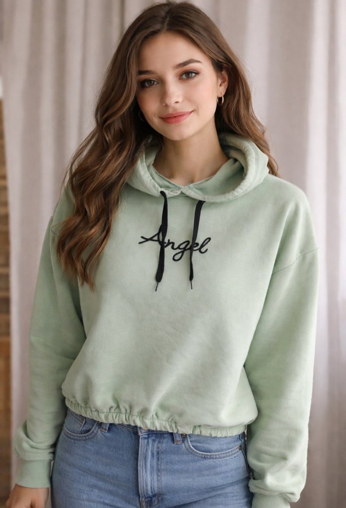 Yumuşak ve sıcak kumaştan, rahat kesimli, pastel yeşil renkte, nakışlı detaylı, yuvarlak yaka ve uzun kollu kadın sweatshirtü. Günlük kullanıma uygun, hafif kısa boyda.