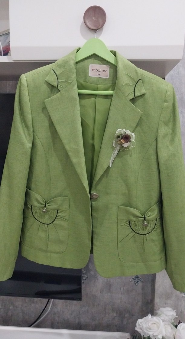 Yeşil keten kumaştan, yakalı ve düğmeli kadın blazer ceket. Nakış detaylı, normal boy ve ofis için uygun, çağdaş tarzda.