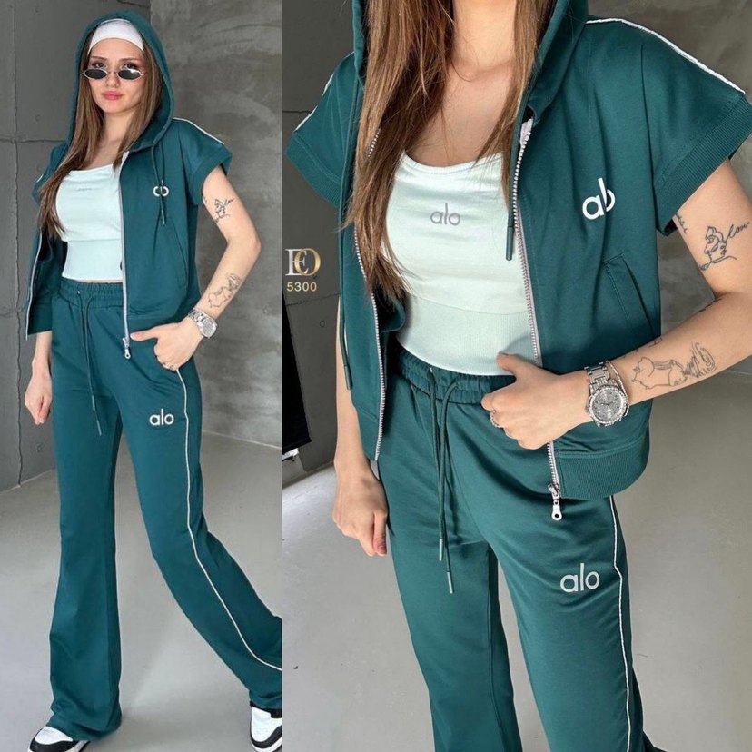 3 parça set.. Koyu yeşil renkte, nakışlı ve kısa kollu kapüşonlu takımdır. Yumuşak ve sıcak kumaştan, bol kesim ve fermuarlı detaylara sahiptir. ♀️