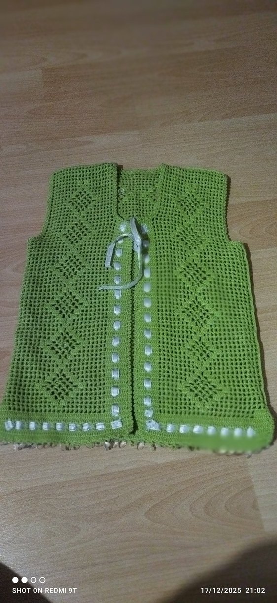 Fitted kesim, yuvarlak yaka ve kolsuz tasarıma sahip çocuk yeleği. Örgü kumaştan yapılmış, renkli nakış desenleri ve kısa boyu vardır. Günlük rahat kullanım için uygundur. El emeği örme çok şık ve güzel 2-3 yaş uyumlu harika bir yelektir.