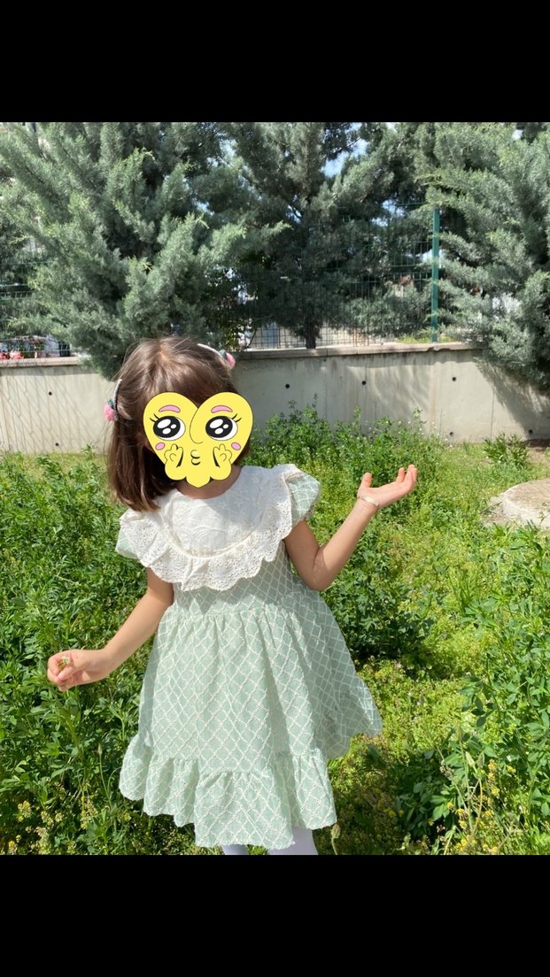 Nakışlı desenlere, yakasında dantel detaya ve kısa kollara sahip yeşil, bol kesim kız çocuk elbisesi. Yumuşak sentetik kumaştan, bohem tarzını yansıtır.