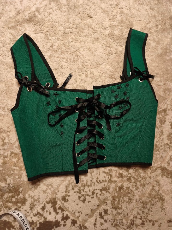 Nakışlı detaylara sahip, yeşil ve gövdeye oturan bu korse, tasarımıyla dikkat çekiyor. m-L beden için uygundur, önden bağlamalı ve balenlidir.