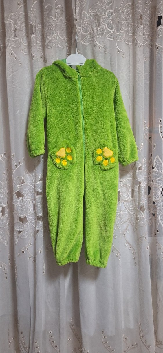 Renkli yeşil dinazor tulumu, yumuşak kürklü kumaş ve ceplerinde nakışlı pati detayları ile normcore tarzında. almanyadan hediye gelmisti az kullanildi kucuk bir kuauru var resimde gosterdim