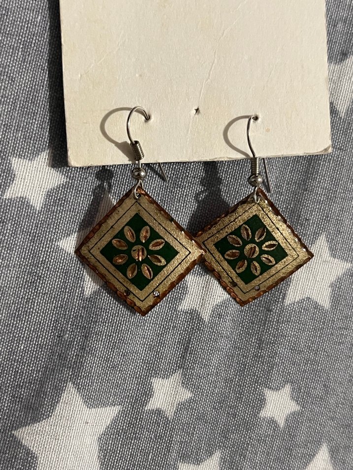 Kısa uzunlukta, yeşil renkli, parlak nakışlı ve boncuk detaylı bohem tarzda vintage küpelerdir.
