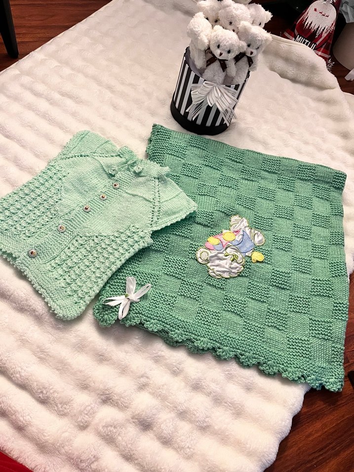 Yeşil Nakışlı Örgü Bebek Battaniyesi Kısa Kol bebek Yeleği