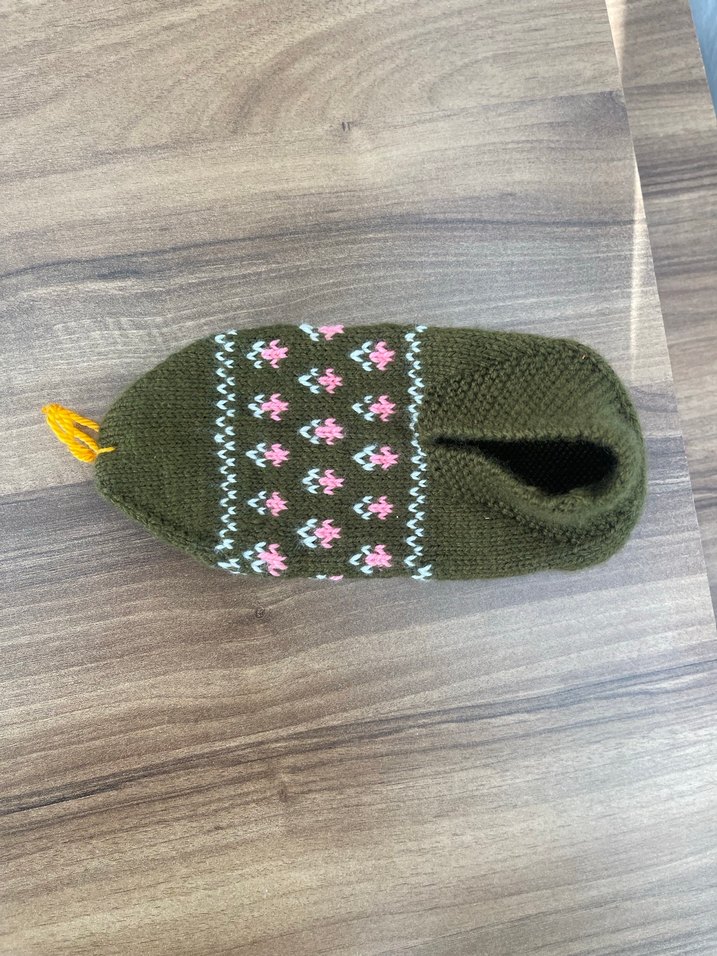 Renkli nakış detaylı, yeşil örgü kadın patiği , konforlu dolgu topuklu, bohem tarzda günlük kullanım için uygun.Ürünümüz beş şiş ile işlenmiştir
