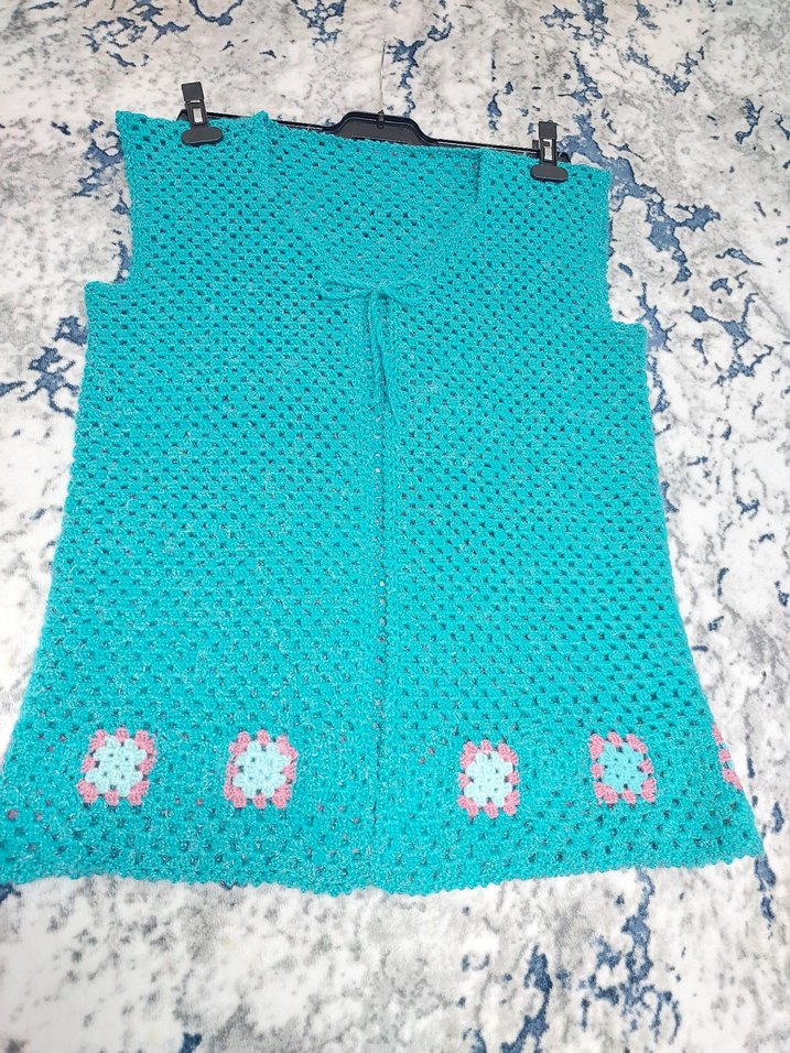 yeşil renkli, nakış detaylı, kolsuz ve bol kesim örgü kadın yelek. 38,40.42 beden uyumlu