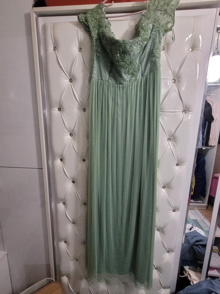 Nakışlı ve drapeli, straplez uzun yeşil abiye elbise. Bohem tarzda, klasik şıklık sunar, düğünler için uygundur.