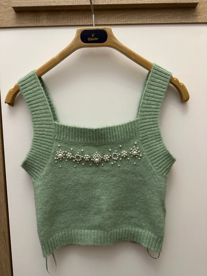 Fitted kesim, pastel yeşil renkte triko kolsuz süveter, önünde nakışlı çiçek detaylarıyla gündelik kullanıma uygun bohem tarz sunar. Temiz ve hasarsız etiketi üzerindedir
