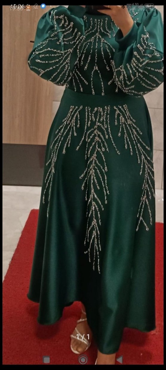 Yeşil, uzun kollu ve V yakalı abiye elbise, parlak nakışlarla süslenmiş ve drapeli klasik şıklık sunar.