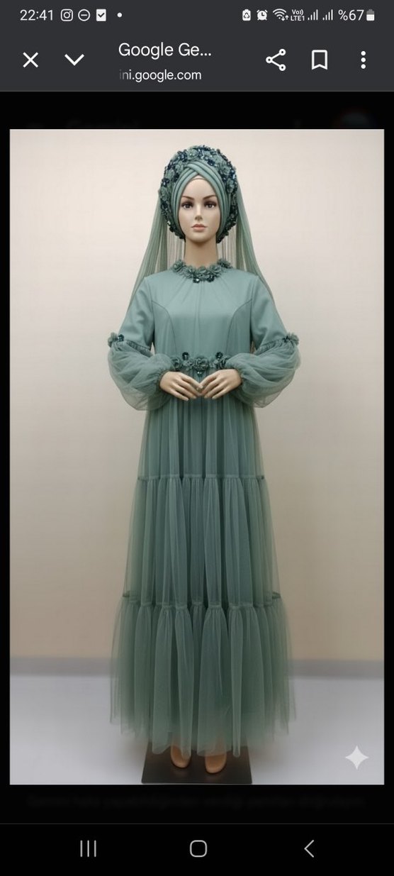 Yeşil pastel renkte, nakışlı çiçek detaylı, bol kesim ve şeffaf askılı uzun bohem elbise, düğünler için uygun.