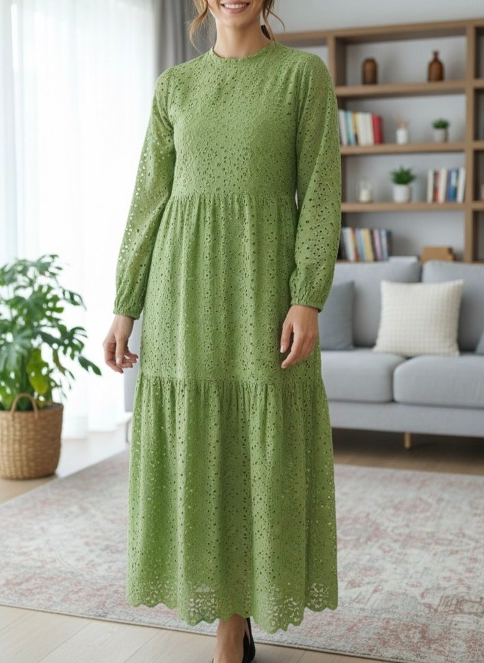 Yeşil renkli, nakış desenli ve fırfır detaylı uzun, bol kesim elbisedir. Uzun kollu ve V yaka, yumuşak sentetik kumaştan yapılmıştır. ürün sıfır hiç giyilmemiştir.