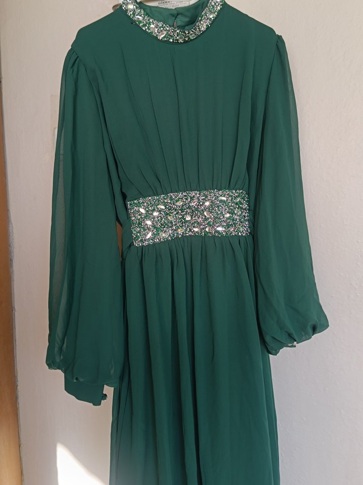 Yeşil renkte, uzun kollu ve yüksek yakalı, bol kesim bohem tarzda uzun elbise. Bel ve yaka kısmında işlemeli süslemeler ve drapeler bulunur. Vintage ve düğünler için uygundur. 1 kez giyildi, kusursuz...