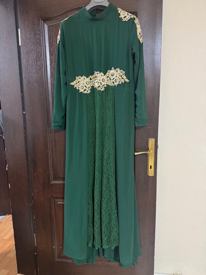 Koyu yeşil, sentetik kumaştan, nakışlı desenlerle süslenmiş, bol kesim ve drapeli uzun kollu kadın elbisesi. Düğün için uygun, mütevazı bohem tarzda.
