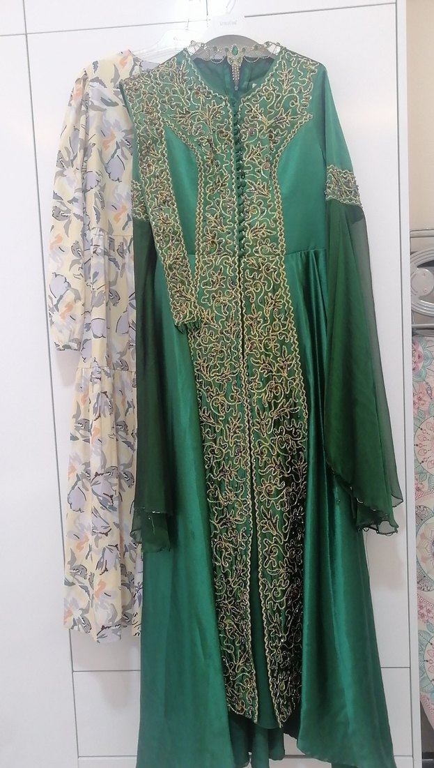 #Koyu yeşil, straplez uzun Hint elbisesi. Nakışlı, salaş kesim ve drapeli detaylara sahip, #kına için uygun. #iki #elbise #hediye tek elbise fiyatına 2 güzel elbise kullanımdan kaynaklı kollarında bazı #boncuklar düşmüş başka bir sıkıntısı yok. Ürünün alnına takılacak süsü ve bandanası hediye verilecektir.