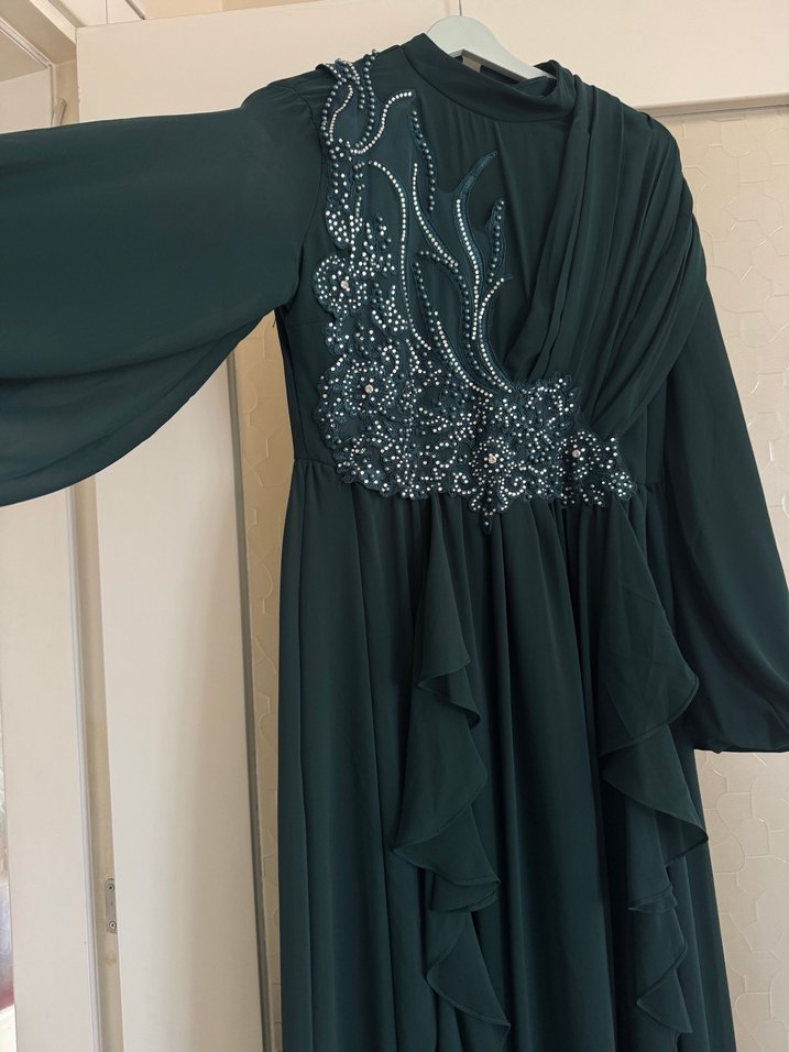 Yeşil renkte, V yakalı, nakış işlemeli, uzun kollu ve bol kesim drapeli abiye elbisedir. Düğünler için uygundur.