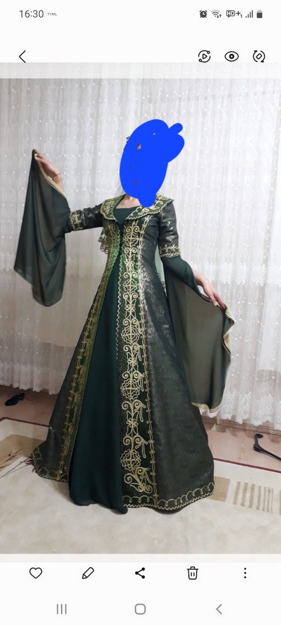 Koyu yeşil, straplez, uzun kollu ve drapeli bu dar kesim bindallı, zarif nakış detaylarıyla düğünler için klasik şıklık sunar. 36 beden 1 kez giyildi