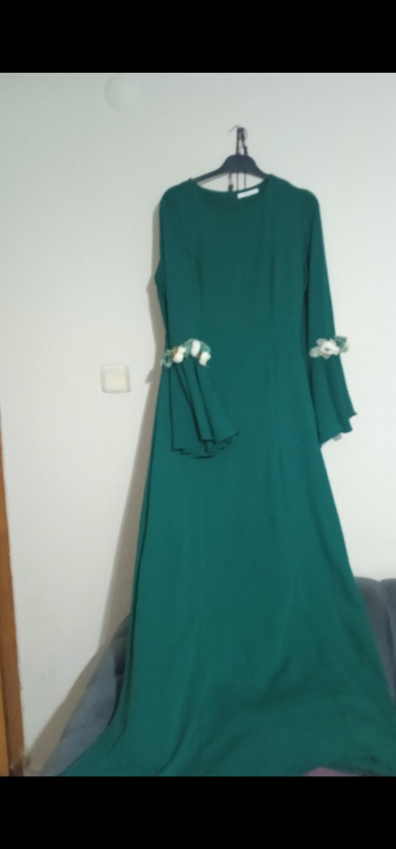 Koyu yeşil renkli, uzun kollu ve yuvarlak yakalı, nakış detaylı, bol kesim kadın elbisesi. Kollarda drapeli ve sade bohem tarzda, düğün için uygundur.
