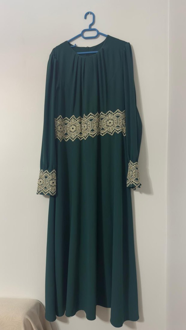 Koyu yeşil renkte, uzun kollu ve salaş kesim uzun elbise. Bel ve manşetlerde nakış detayları bulunan, dökümlü ve sentetik kumaştan üretilmiş bohem tarzda sade bir model.