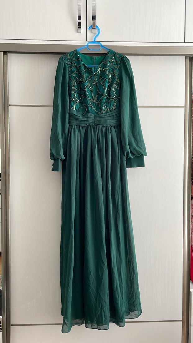 Yeşil Nakışlı Uzun Kollu Uzun Elbise