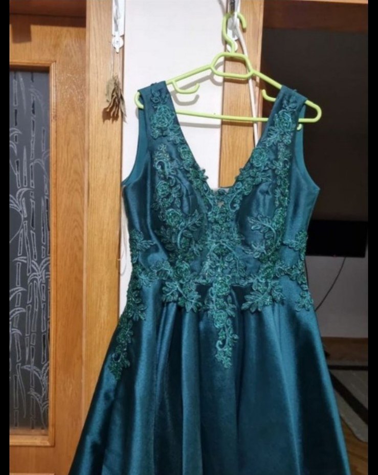 Bu koyu yeşil abiye elbise, V yakalı ve kolsuz tasarıma sahip, vücuda oturan kesimdedir. Nakışlı ve drapeli detaylarıyla vintage bohem tarzını yansıtır, düğünler için uygundur.