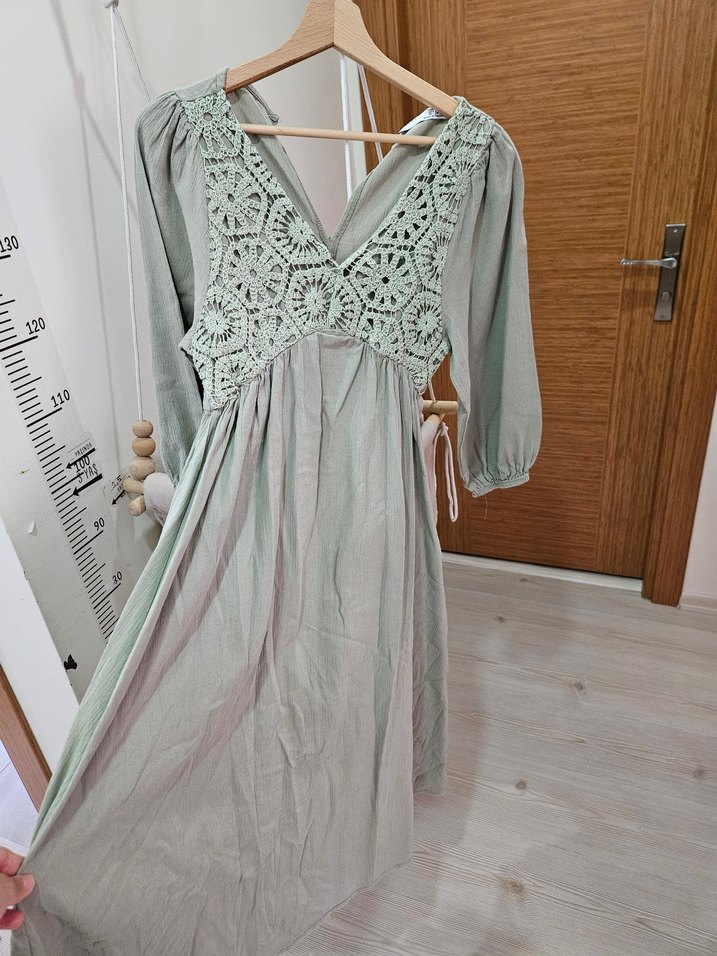 Bej renkte, V yaka ve dantel nakışlı bohem uzun elbise. Yumuşak pamuk kumaştan, bol kesim ve uzun balon kollu, rahat bir model. hamile giyime uygun