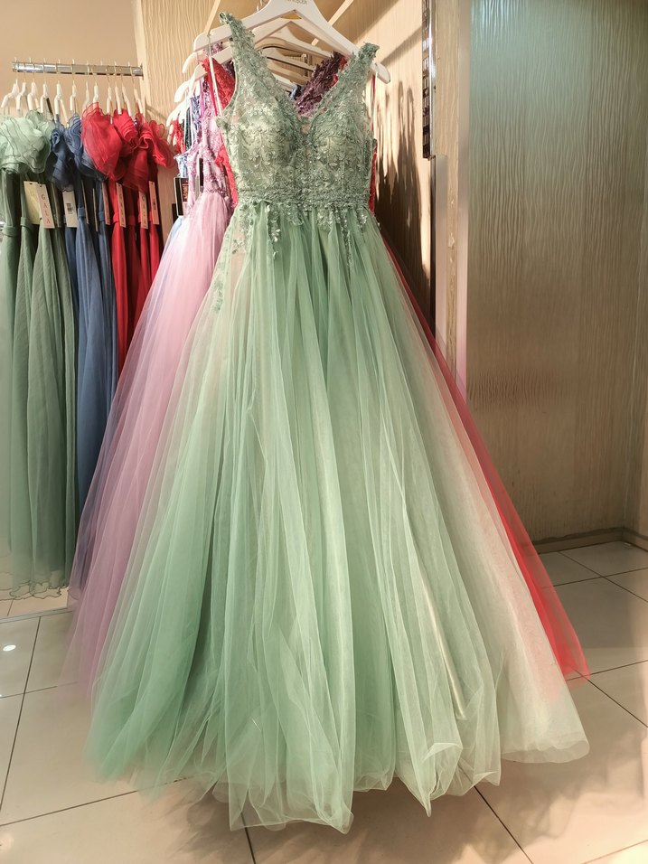 Yeşil Nakışlı V Yaka Uzun Abiye Elbise