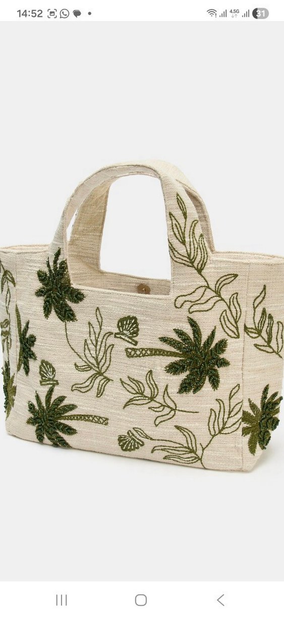 Yeşil renkli tekstil kadın çanta, nakış ve boncuk işlemeli yaprak desenlerine sahiptir. Kısa saplı ve düğmeli kapanışlıdır, günlük kullanım için uygundur.