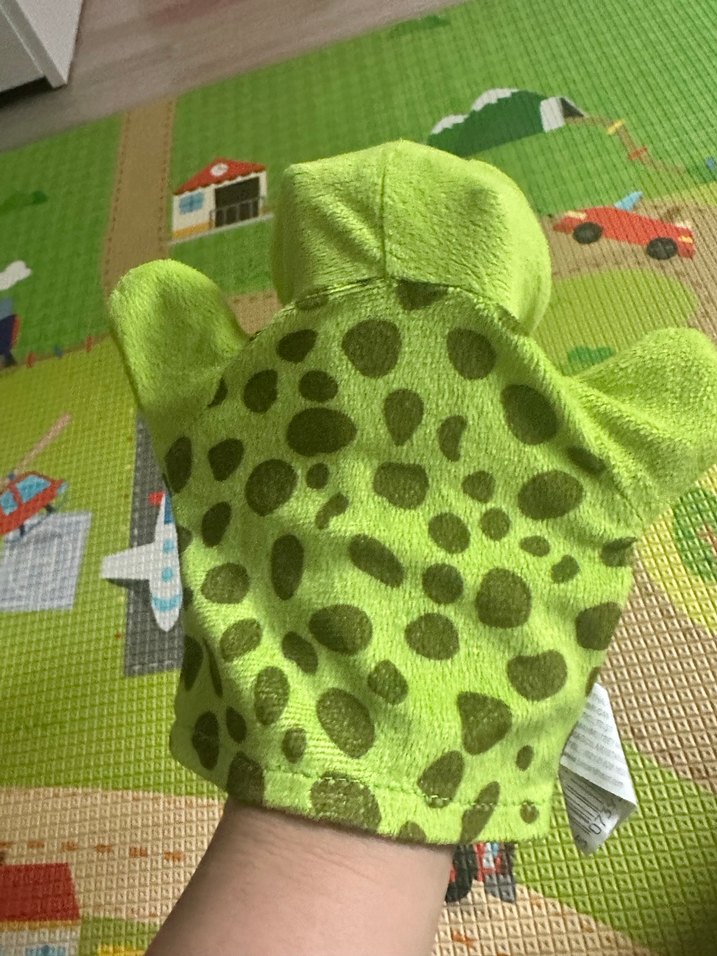 Noktalı desenli, yumuşak ve rengarenk yeşil peluş el kuklası, oyun için uygundur.