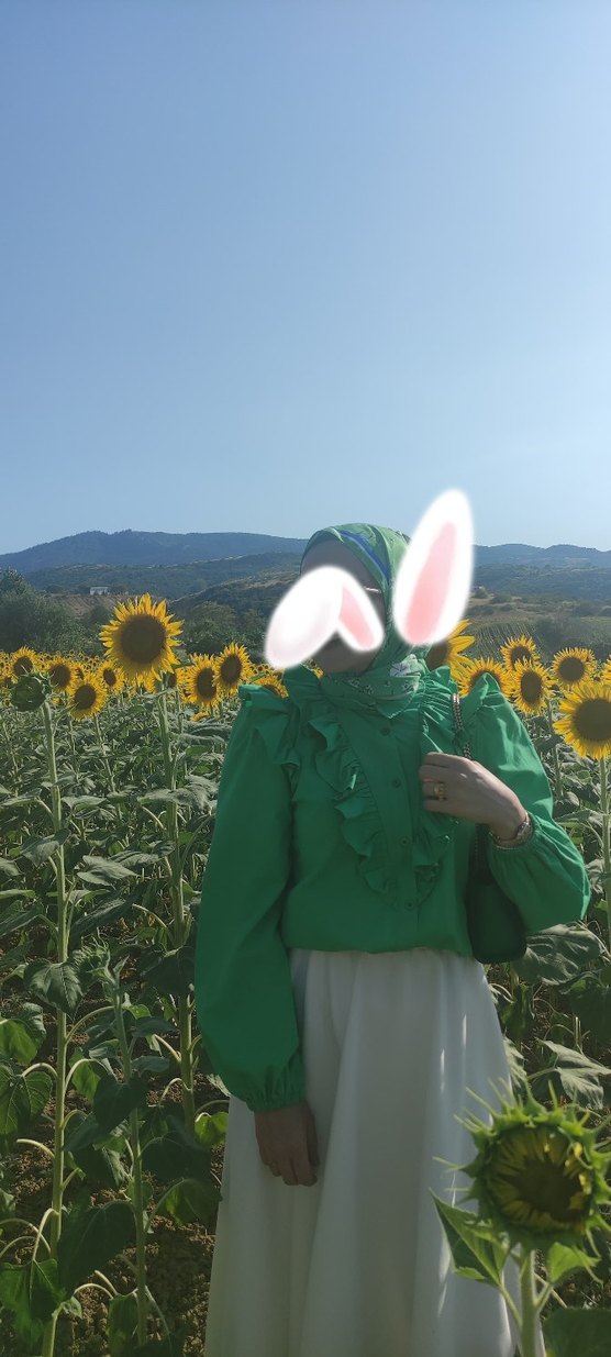 yeşil ön ve arka fırfırlı uzun kol gömlek kumaşı gayet rahat bu resimde 50 kiloyum tam oluyor 62 kiloya kadar giyilebilir