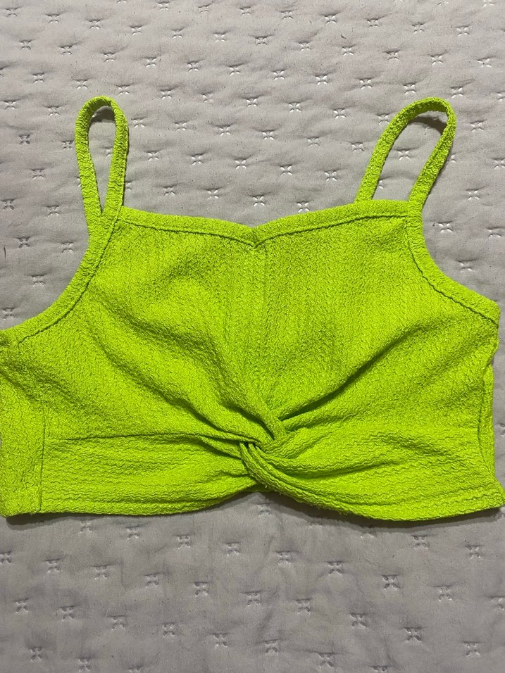 Yeşil renkli, örgü dokulu, ince askılı ve straplez yaka tasarımlı, kısa ve vücuda oturan crop top. Plaj için uygun.etiketi kesik olduğundan ölçülere göre karar verin tahminen 7-8 yaş gibi duruyor tek kusuru önündeki büzgülü yerinde sökülme var yırtık değil fotoğraflarda göstermeye çalıştım