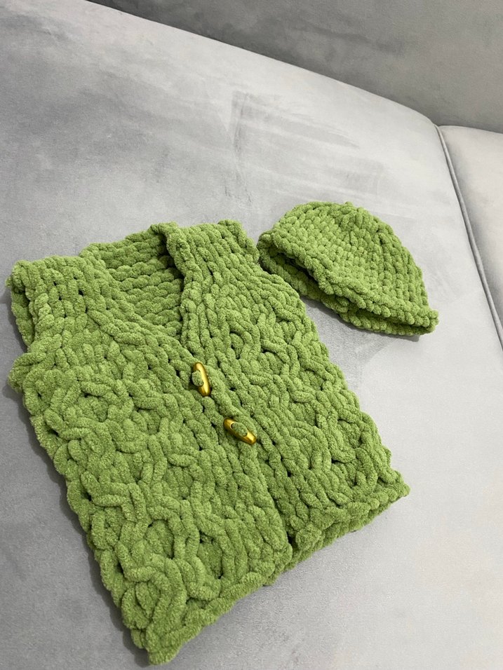 Renkli yeşil örgüden yapılmış, sade ve bohem tarzda çocuk yeleği ve şapka seti. Örgü dokusu sıcaklık ve şıklık sağlar.
