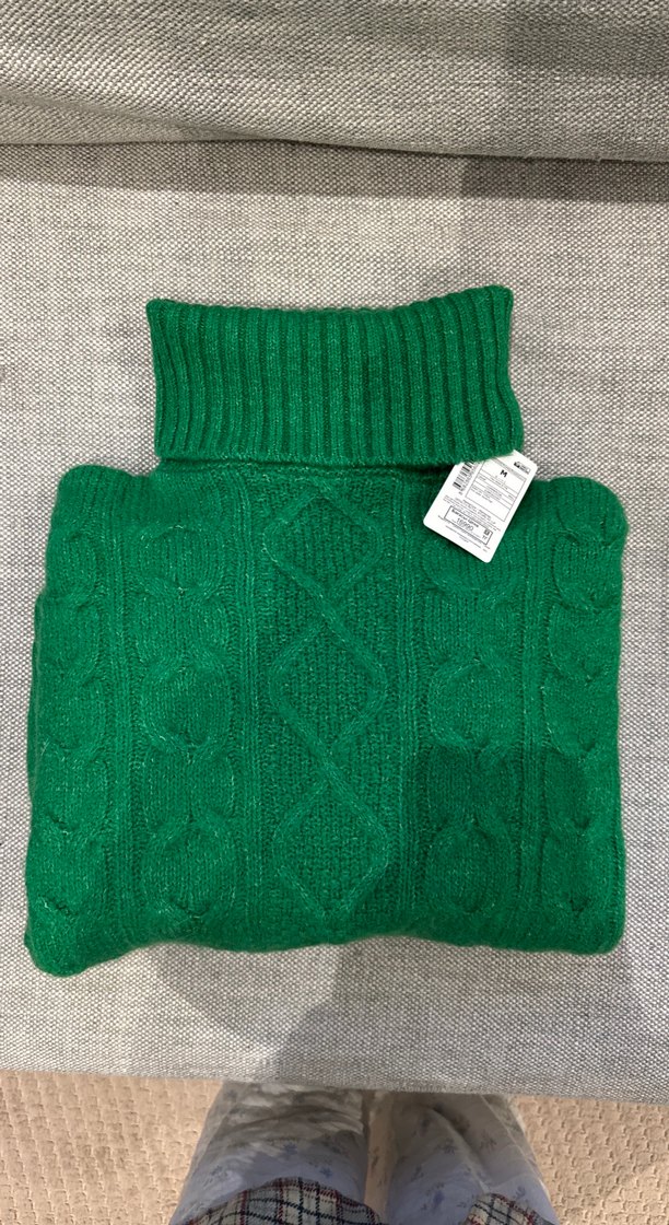 Yeşil, örgü kadın kazağı boğazlı ve uzun kolludur. Yumuşak yünden, işlemeli desenlerle günlük rahatlık sunar. Kalın yumoş