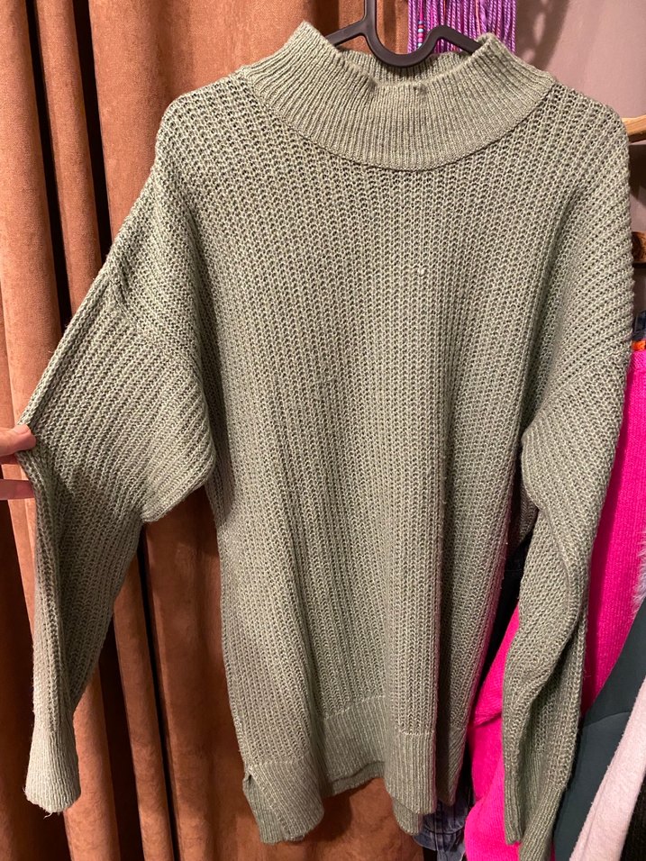 Yeşilörgü, boğazlı ve uzun kollu, bol kesim kadın kazak. Normal boyda, sade ve desensiz tasarımıyla rahat günlük sokak stili için uygundur. Ürünün kusuru fotoğrafta mevcuttur
