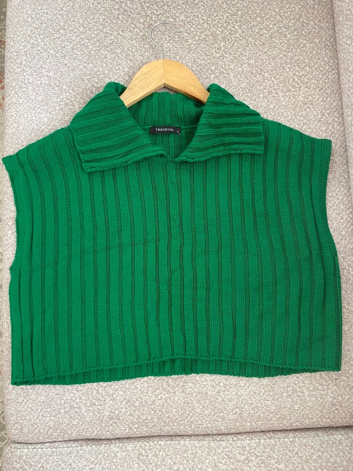 Yeşil renkli, örgü dokulu, boğazlı ve kolsuz kısa kesim, salaş fitli kadın süveter. Trend sokak giyimi için uygun.
