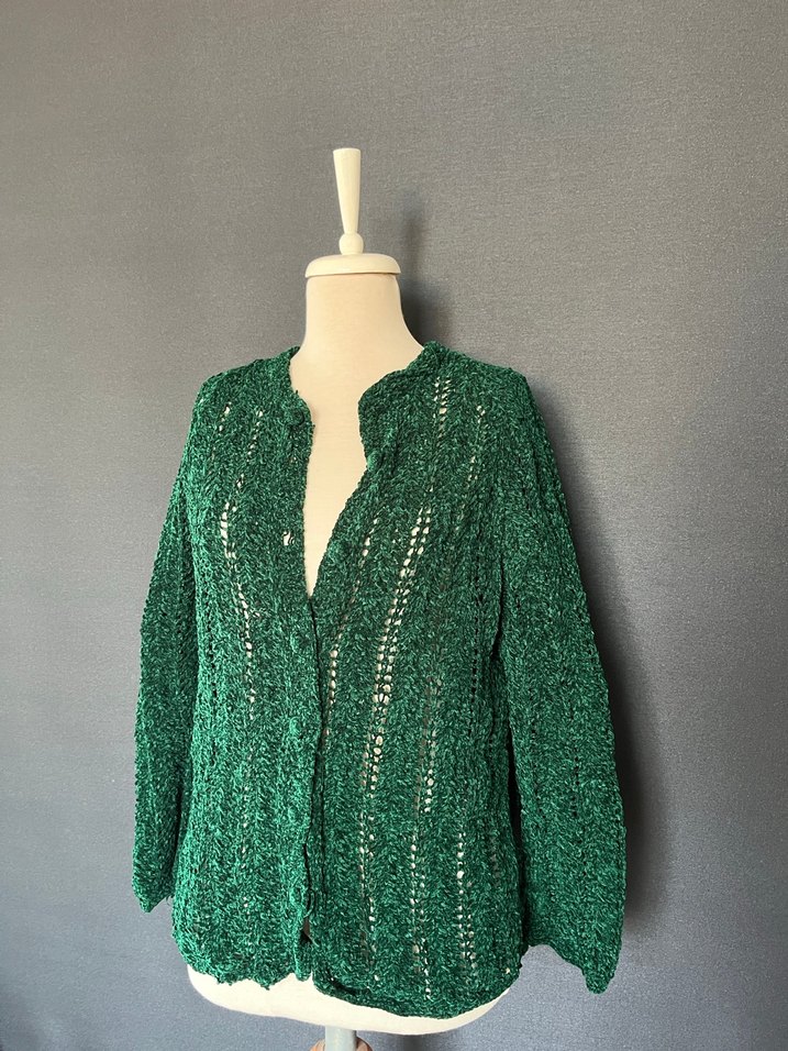 Yeşil renkli, uzun kollu ve yuvarlak yakalı örgü hırka. Bol kesimi, parlak dokusu ve midi boyu ile bohem tarzını yansıtır.