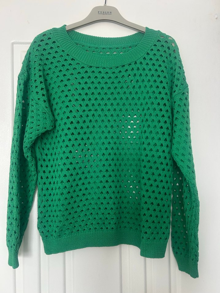 Yeşil örgü, yuvarlak yaka ve uzun kollu bol kesim kazak. Renkli, rahat tasarımı günlük sokak stiline bohem bir hava katıyor. Standart beden