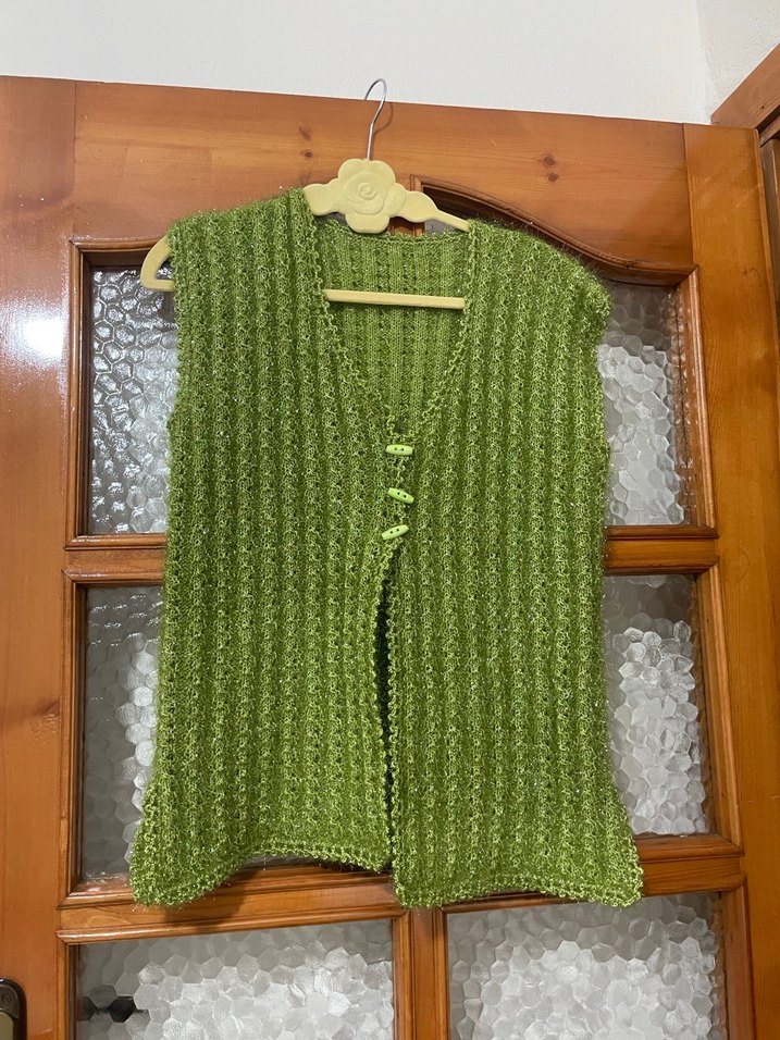 Yeşil renkli, V yaka ve kolsuz tasarıma sahip örgü yelek. Parlak dokusu ve bohem tarzıyla günlük kullanıma uygundur. Ürün hiç kullanılmadı çeyizlik örgülü yelek.