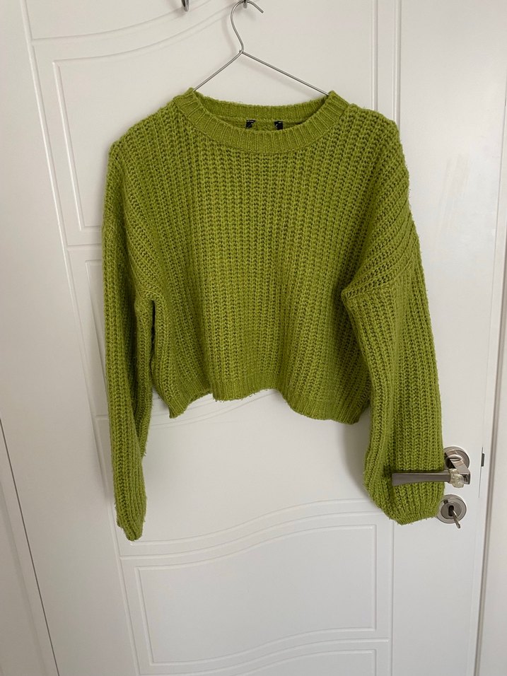 Yeşil renkli, örgü kumaştan yapılmış, yuvarlak yakalı ve uzun kollu, bol kesim kadın kazak. Günlük kullanıma uygun rahat ve şık bir parça.