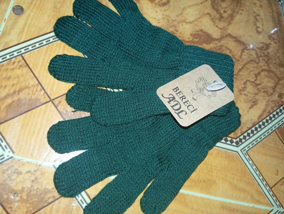 Yeşil renkte, örgü dokulu, rahat bohem tarzını yansıtan eldivenleri. Üzerinde "BERECi" etiketi bulunur.