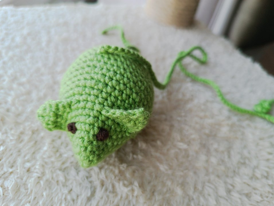 Detaylı kulak ve gözlere sahip renkli yeşil örgü fare, kedi oyuncağı.