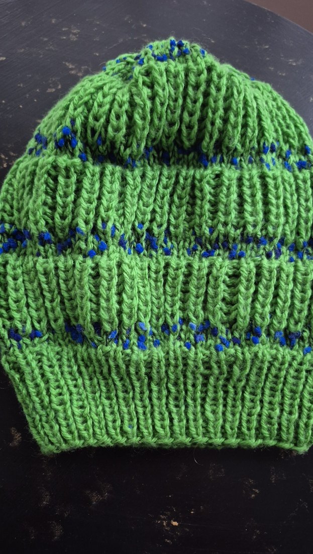 Yeşil ve mavi detaylı, yumuşak örgü kumaştan yapılmış kadın bere. Rahat ve renkli tasarıma sahip.