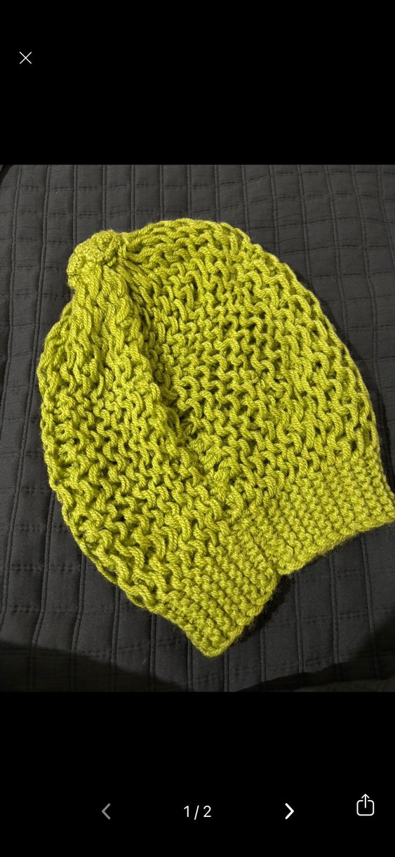Canlı yeşil renkte, örgü dokulu kadın bere. Rahat ve sade tarzıyla kontrkültür havası taşıyor.