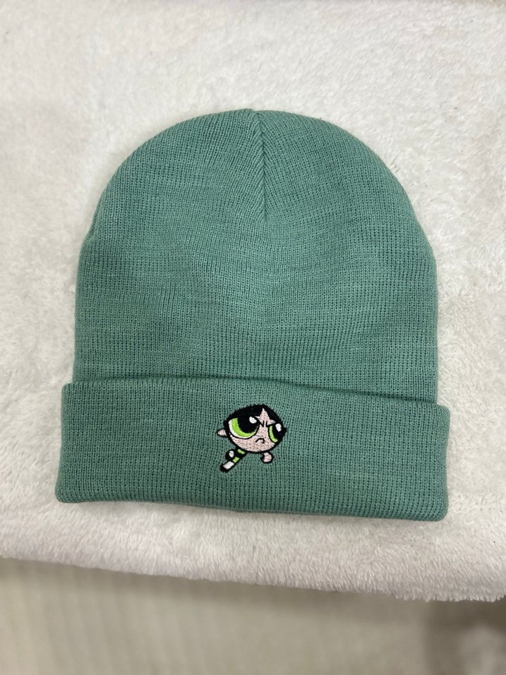 Pastel yeşil örgü kadın bere, yumuşak fleece astarlı ve küçük nakışlı çizgi film karakteri detaylıdır. Rahat ve günlük sokak stiline uygundur.