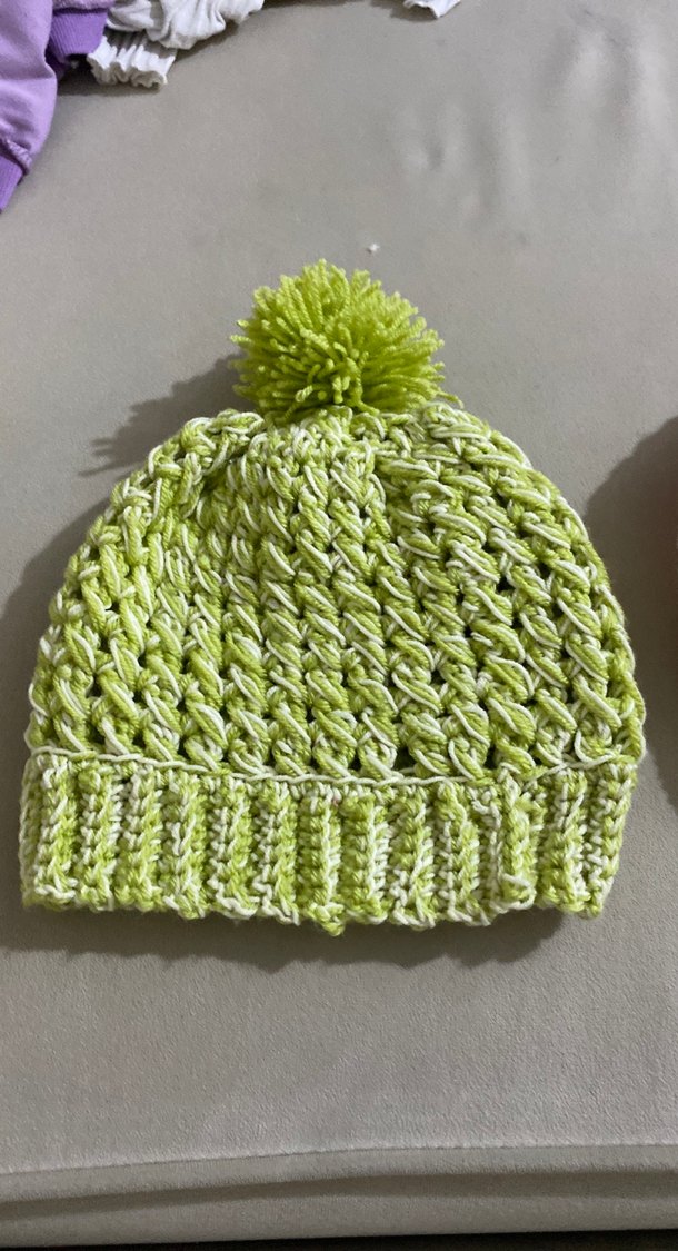Yeşil renkte, üstünde ponpon bulunan yumuşak örgü kadın bere, rahat ve renkli bir görünüm sunar.