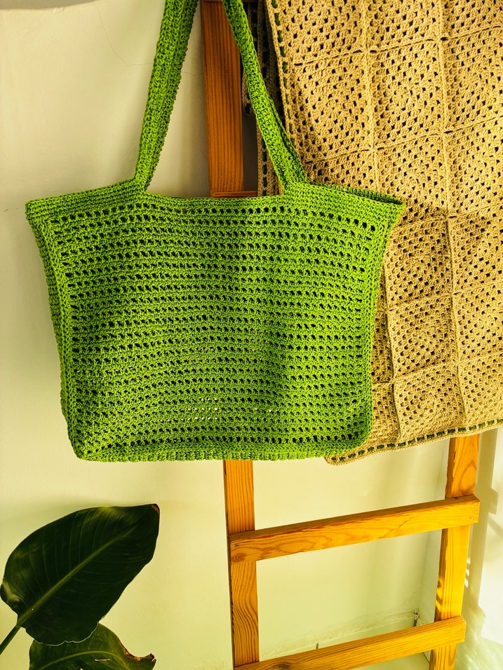 Örgü yeşil örgü kadın çantası. Minimalist bohem tarzıyla günlük kullanıma uygun.Plaj çantası.