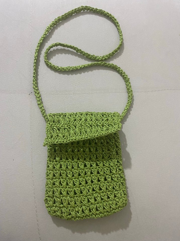 Yeşil örgü çapraz çanta, dantel detaylı ve uzun askılıdır. Minimalist bohem tarzına uygun, desen içermeyen renkli bir tasarıma sahiptir. Kağıt ipten örülmüştür istediğiniz renkte örülür sipariş alınır. Marka temsili