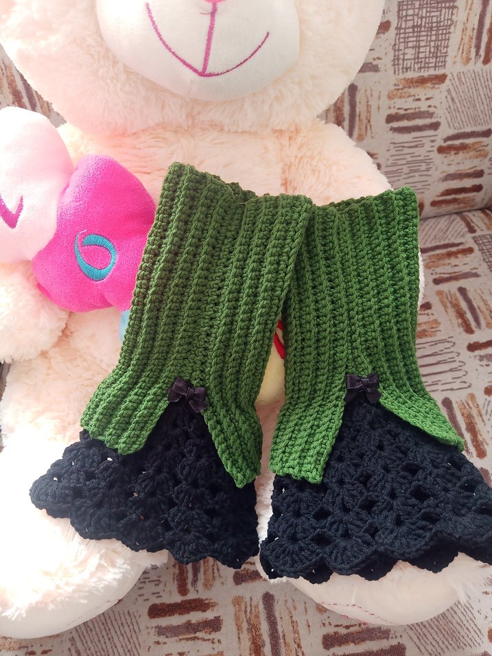 Yeşil örgü kadın eldivenler, siyah dantel manşetler ve küçük fiyonklarla rahat bir tasarım sunar, gotik ve bohem tarzları harmanlar.