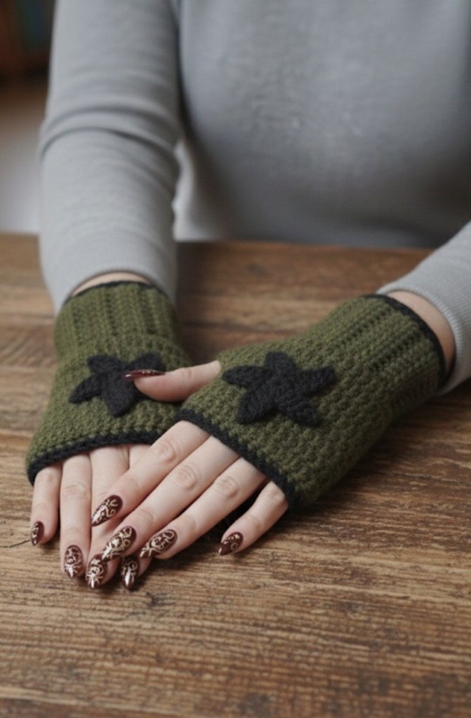 GÖRSEL BANA AİTTİR ✔️ İLAN AÇIYORUM Koyu yeşil örgü kadın eldiveni, siyah yıldız detayıyla rahat bir his sunar. Bohem, hippie ve retro stiller için uygundur.