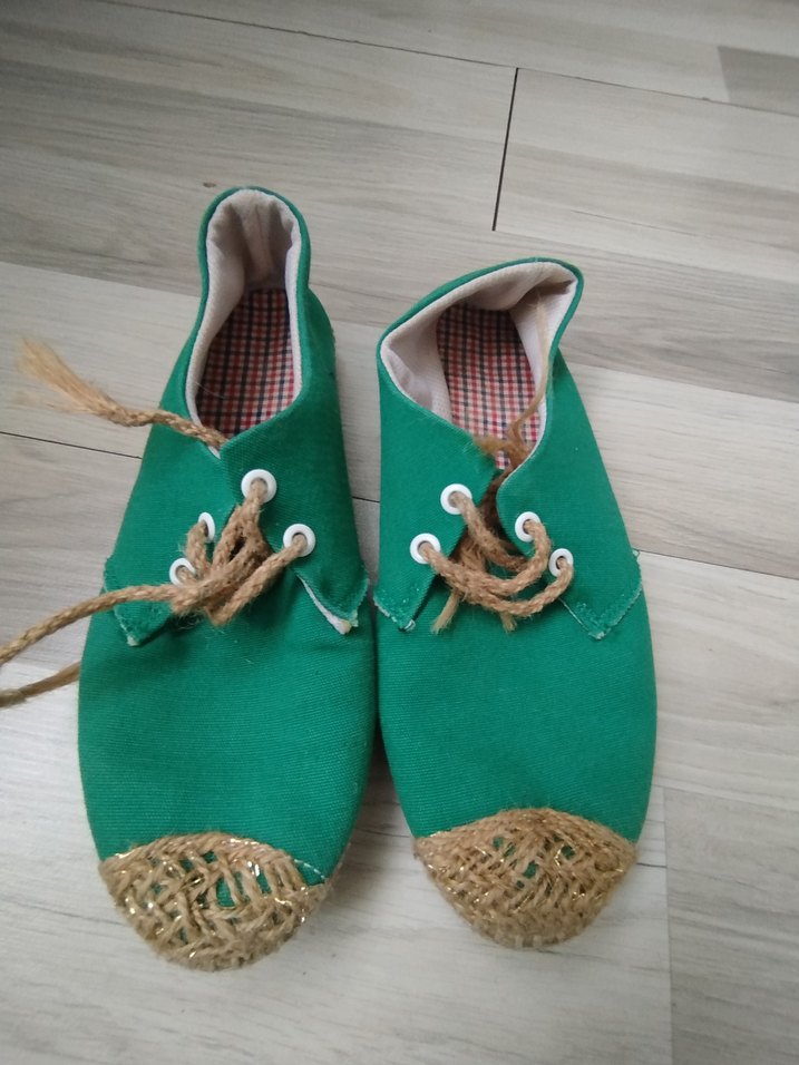 Jüt burunlu ve bağcıklı yeşil örgü düz espadriller, günlük kullanım için minimalist ve bohem tarz sunar.